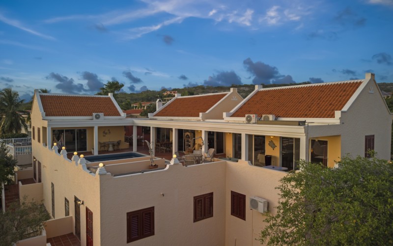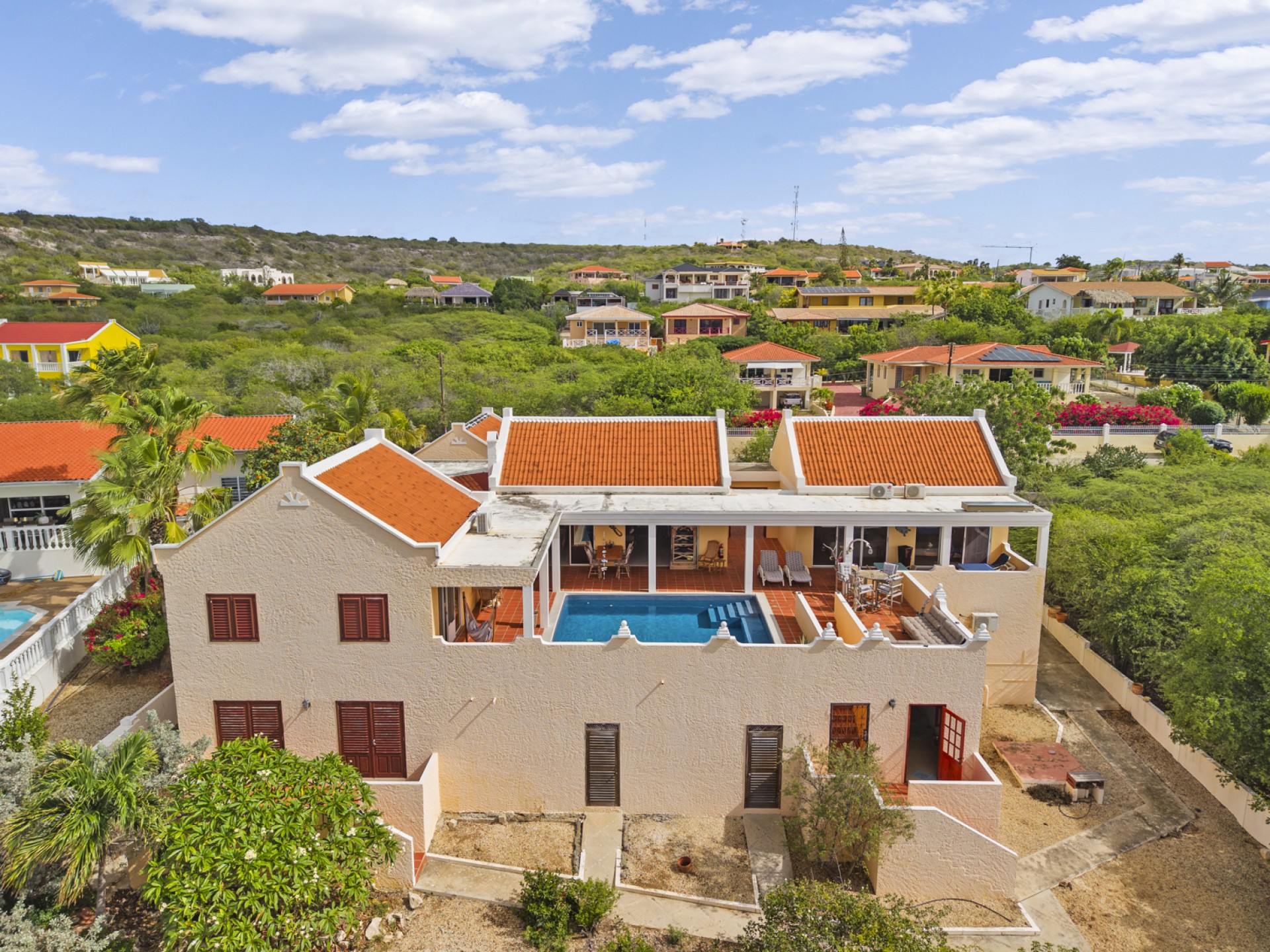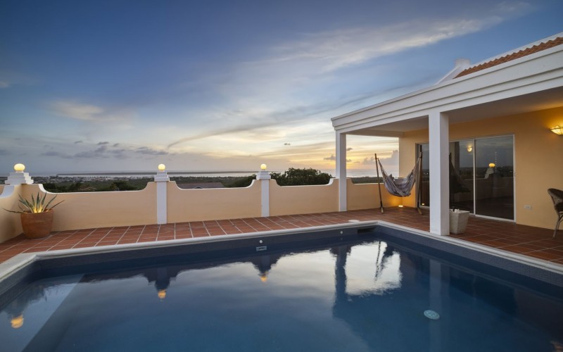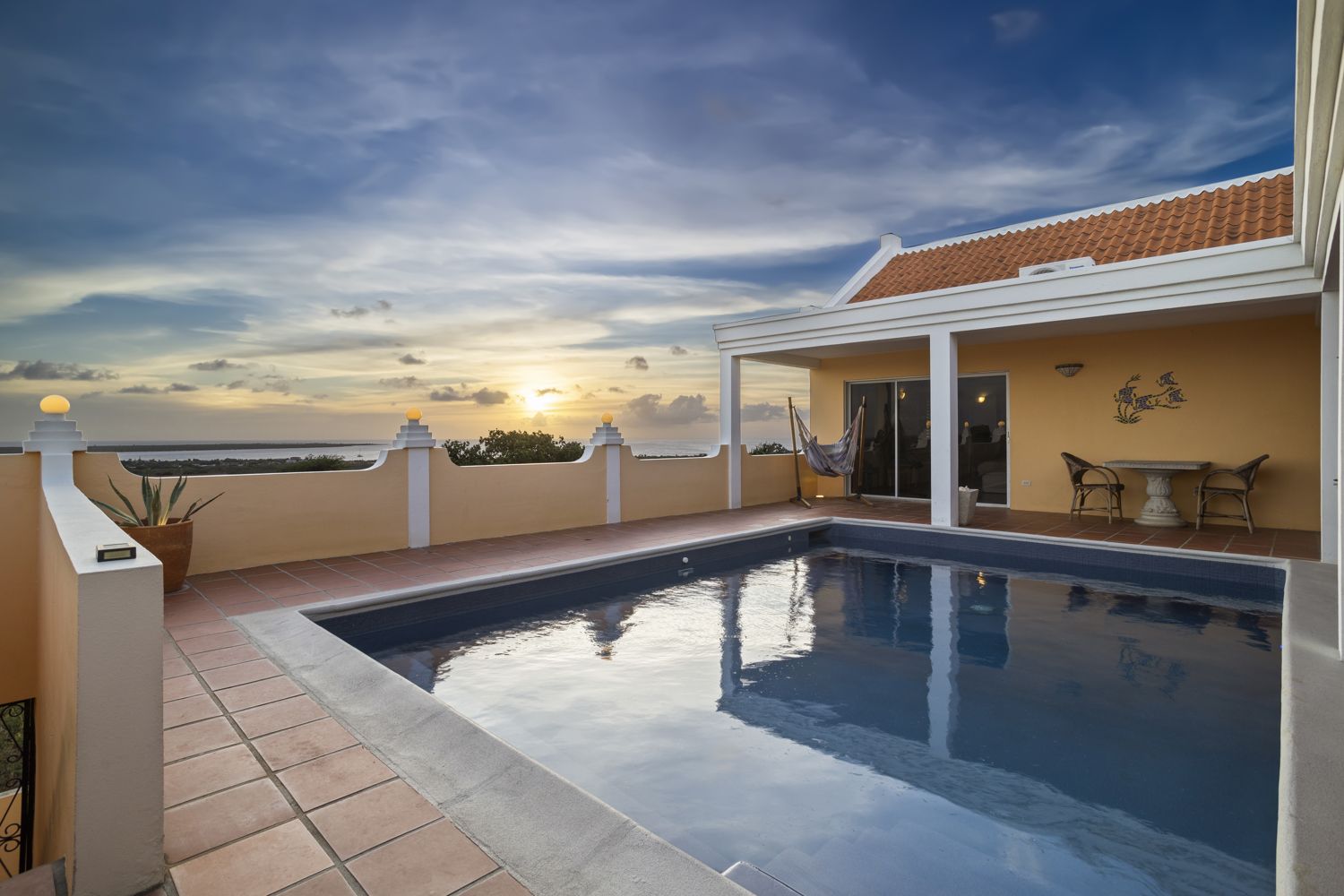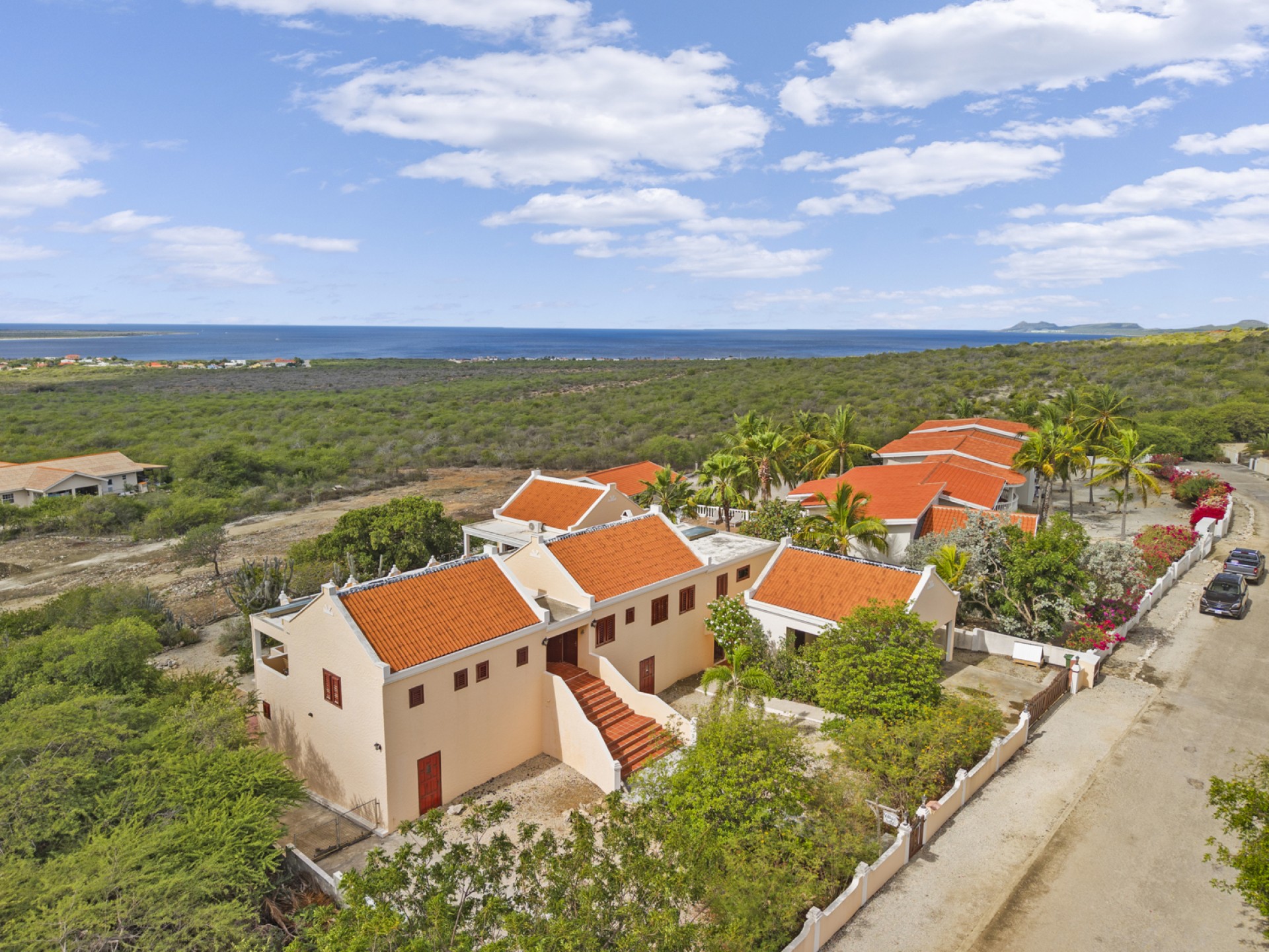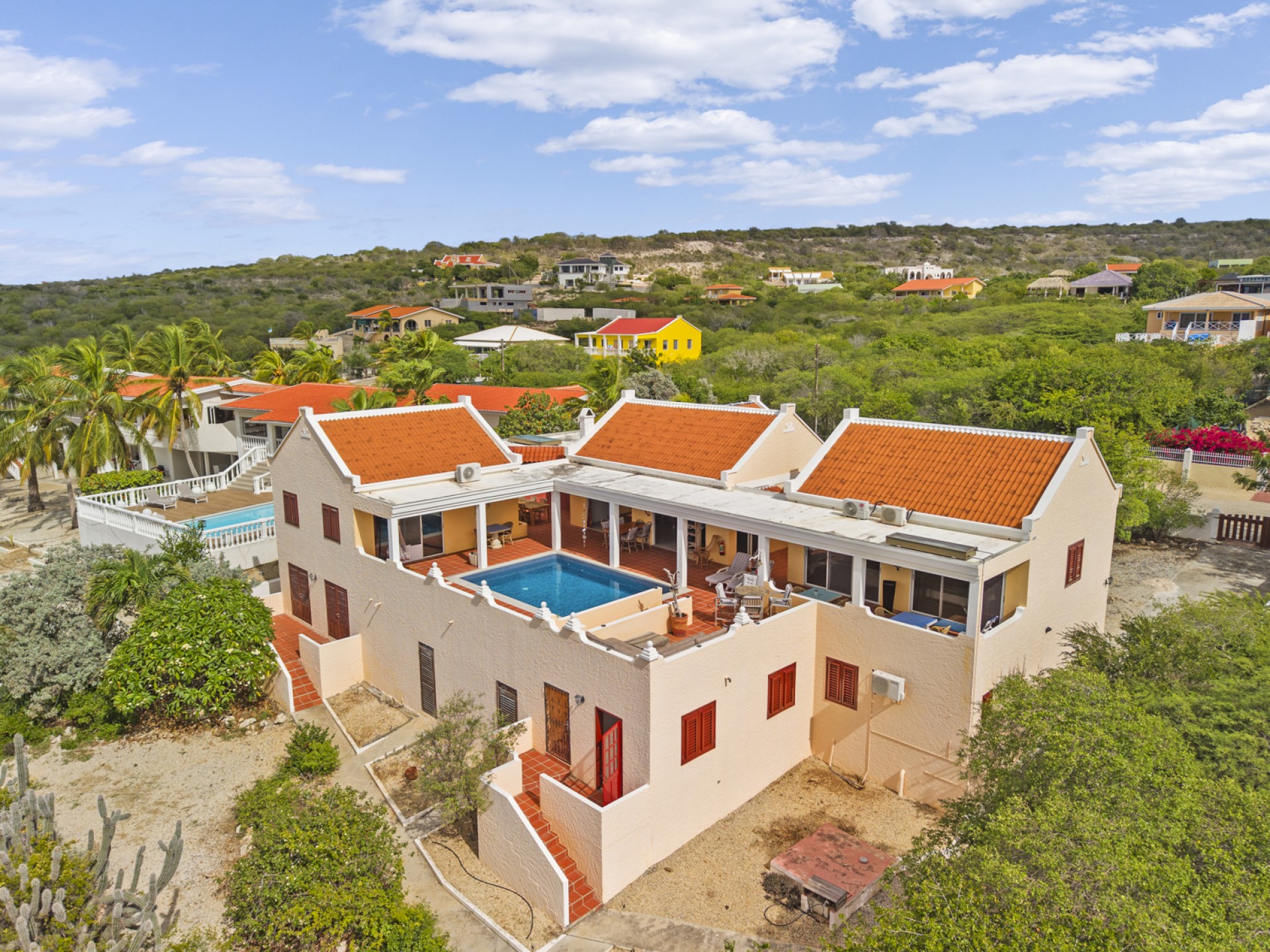 Ik open het poortje aan de voorkant van de straat om naar de voordeur te lopen. Nog niet wetende wat ik daar kon gaan aantreffen. Ik volg het pad, loop de trap op en tingel aan de bel die bij de deur hangt. De houten dubbele deur gaat open en ik verwachtte een ruimte binnen in het huis in te komen maar niets was minder waar. Het was de deur naar een prachtig uitzicht op zee en op heel klein Bonaire, een woning met diverse mogelijkheden, een woning waar u iedere avond kan genieten van de prachtige zonsondergang en waar u uzelf s’ochtends een bevoorrecht mens voelt wanneer u met u ontbijt de eerste momenten van de dag op deze manier mag beleven.