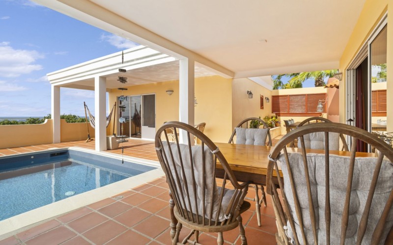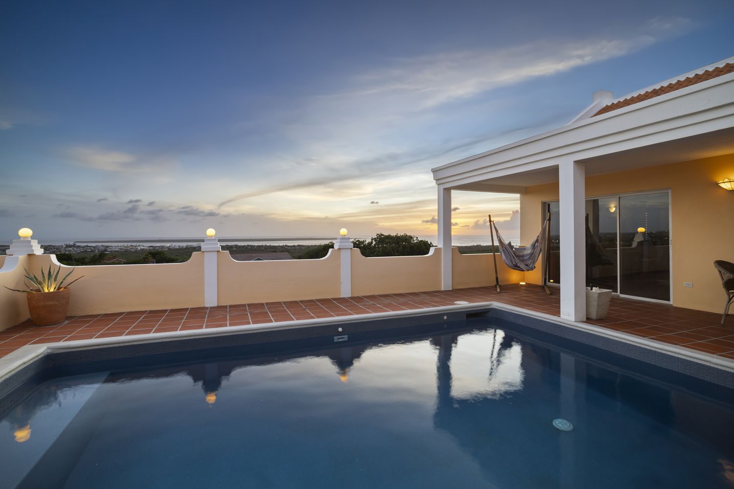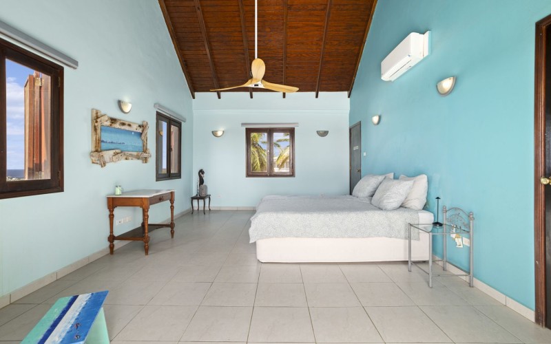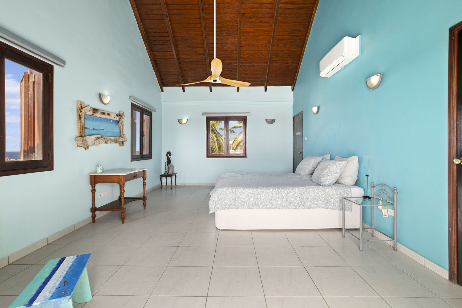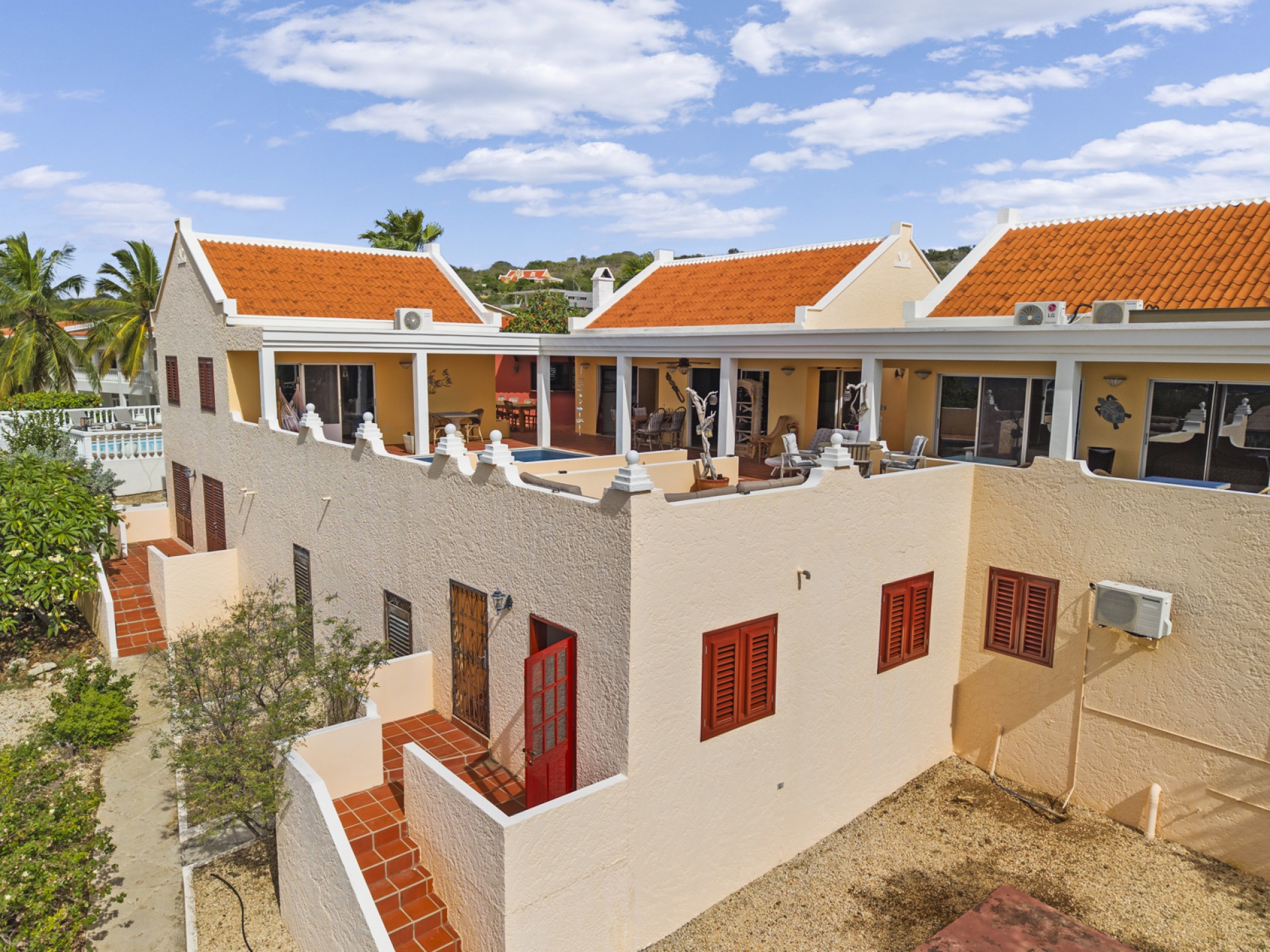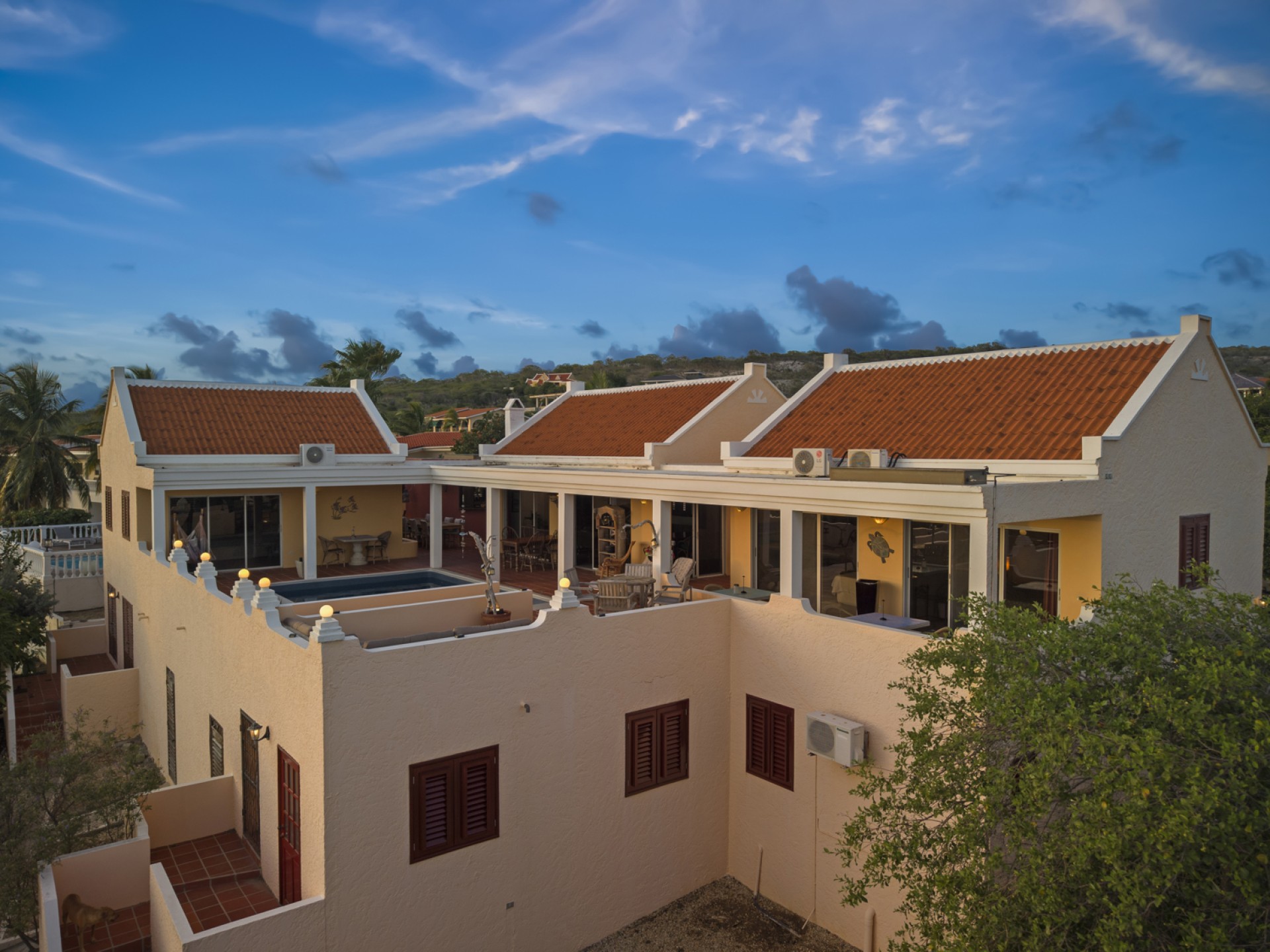 Ik open het poortje aan de voorkant van de straat om naar de voordeur te lopen. Nog niet wetende wat ik daar kon gaan aantreffen. Ik volg het pad, loop de trap op en tingel aan de bel die bij de deur hangt. De houten dubbele deur gaat open en ik verwachtte een ruimte binnen in het huis in te komen maar niets was minder waar. Het was de deur naar een prachtig uitzicht op zee en op heel klein Bonaire, een woning met diverse mogelijkheden, een woning waar u iedere avond kan genieten van de prachtige zonsondergang en waar u uzelf s’ochtends een bevoorrecht mens voelt wanneer u met u ontbijt de eerste momenten van de dag op deze manier mag beleven.