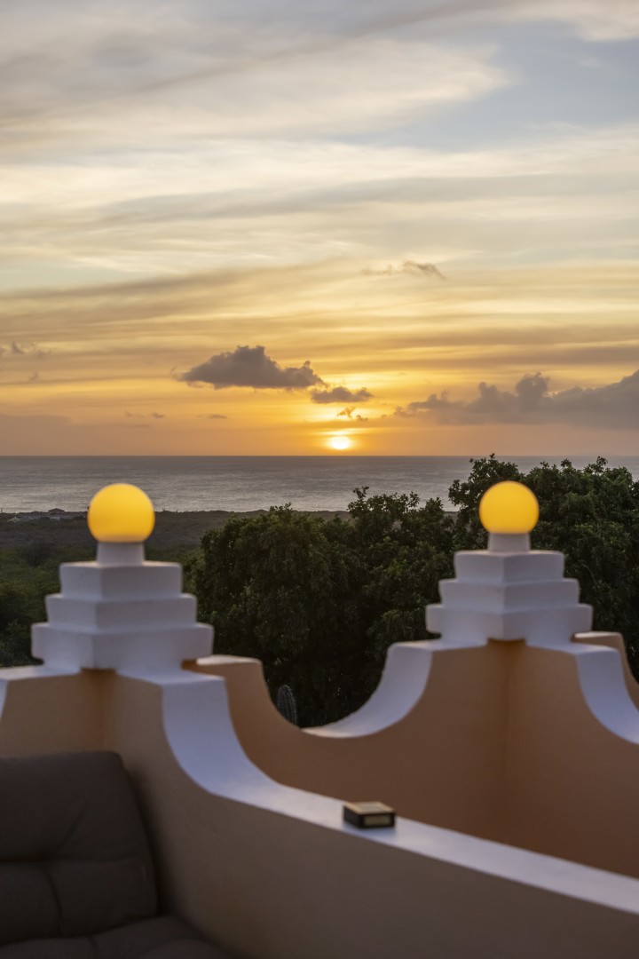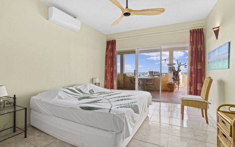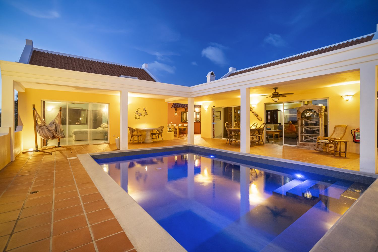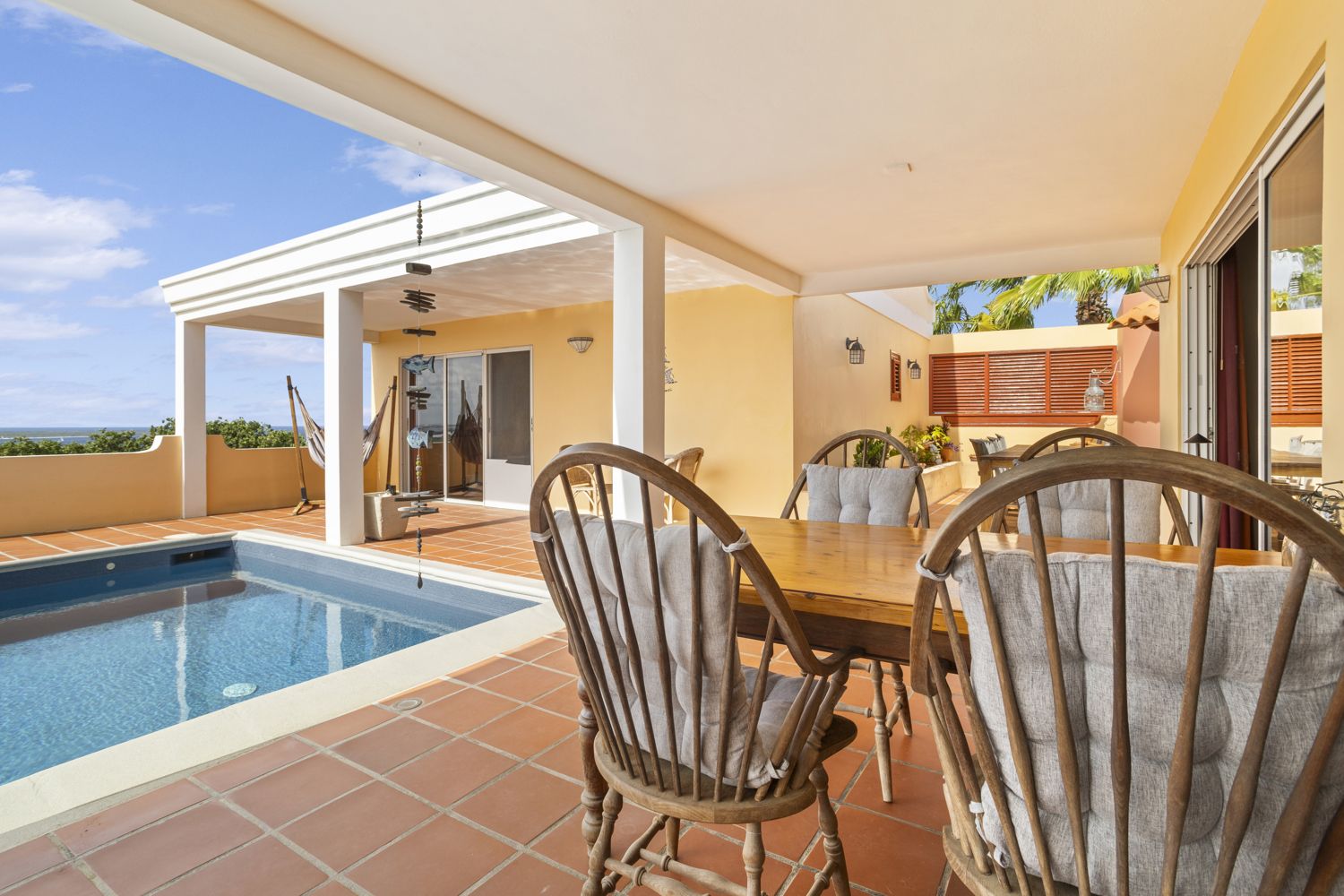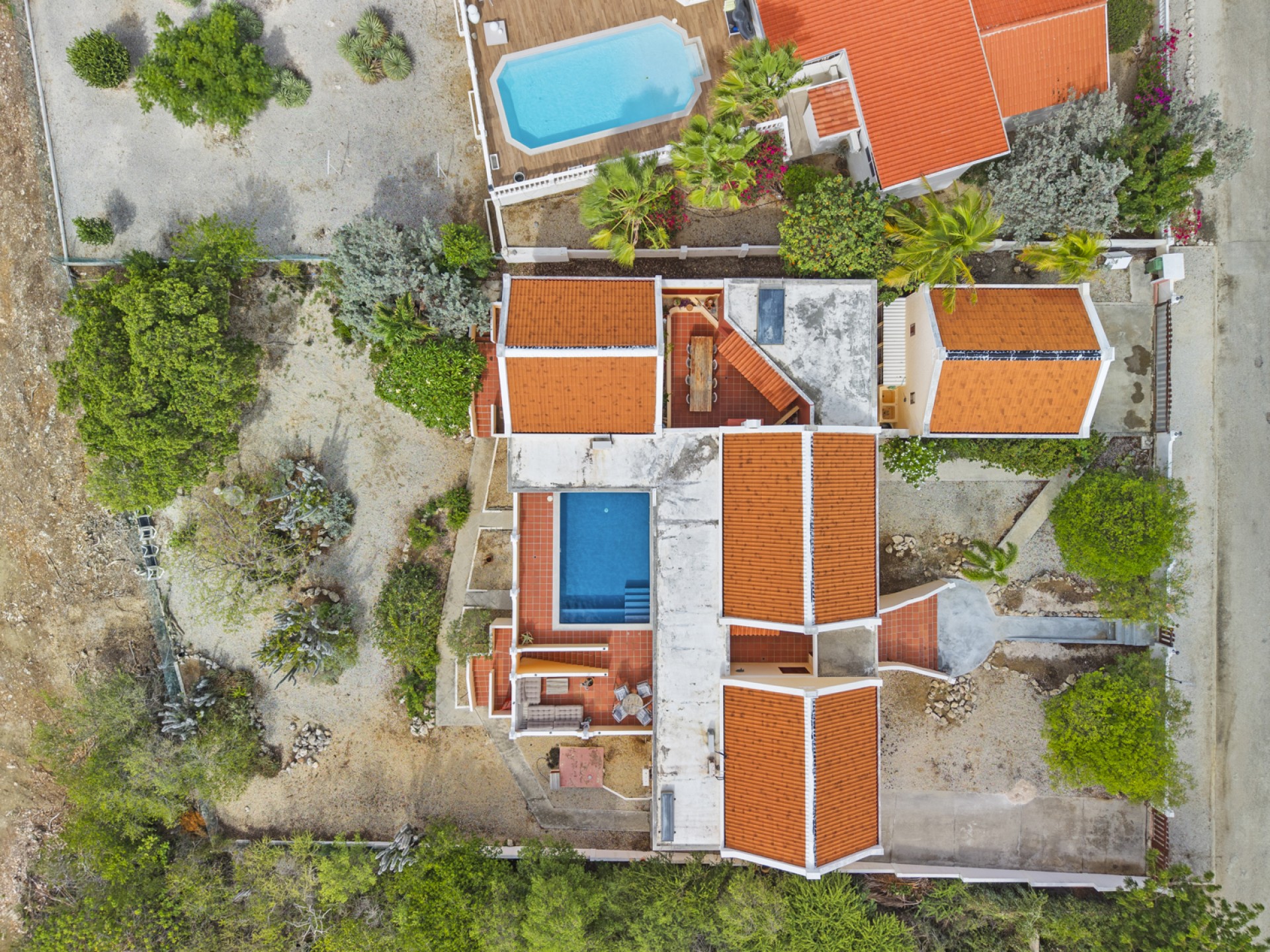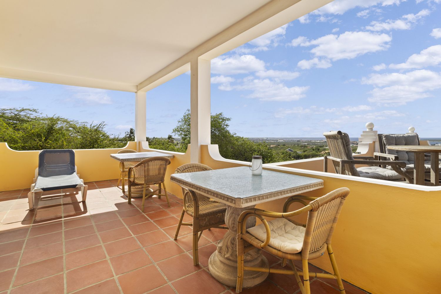 Ik open het poortje aan de voorkant van de straat om naar de voordeur te lopen. Nog niet wetende wat ik daar kon gaan aantreffen. Ik volg het pad, loop de trap op en tingel aan de bel die bij de deur hangt. De houten dubbele deur gaat open en ik verwachtte een ruimte binnen in het huis in te komen maar niets was minder waar. Het was de deur naar een prachtig uitzicht op zee en op heel klein Bonaire, een woning met diverse mogelijkheden, een woning waar u iedere avond kan genieten van de prachtige zonsondergang en waar u uzelf s’ochtends een bevoorrecht mens voelt wanneer u met u ontbijt de eerste momenten van de dag op deze manier mag beleven.