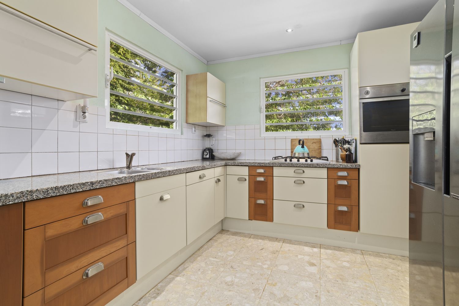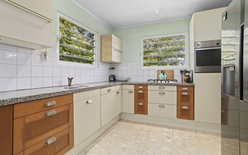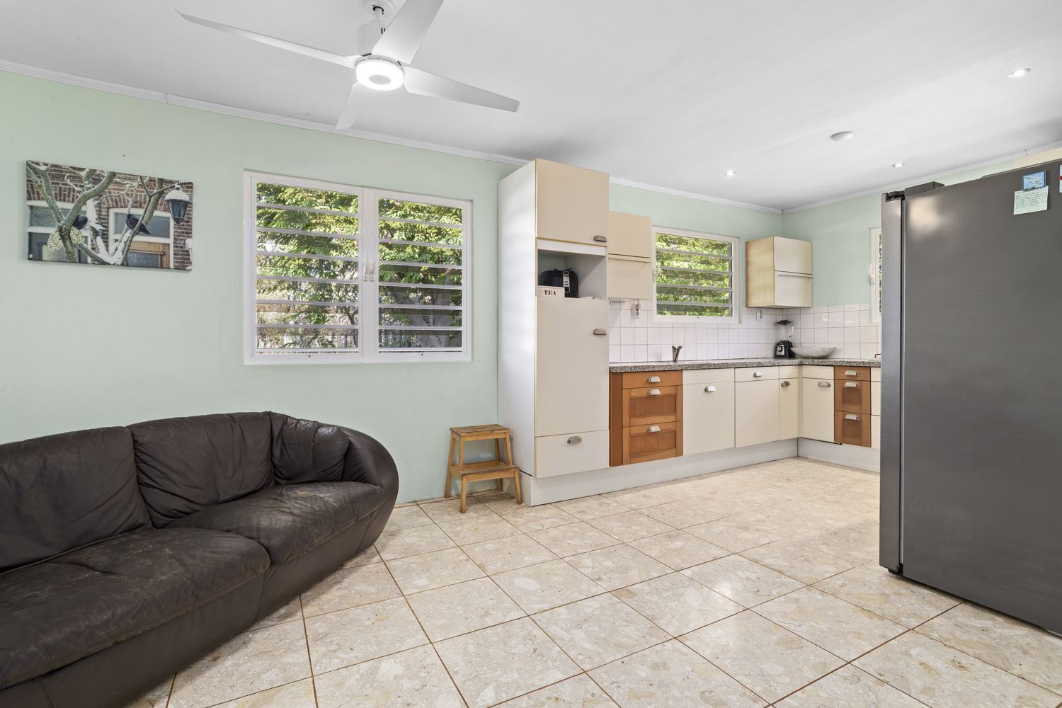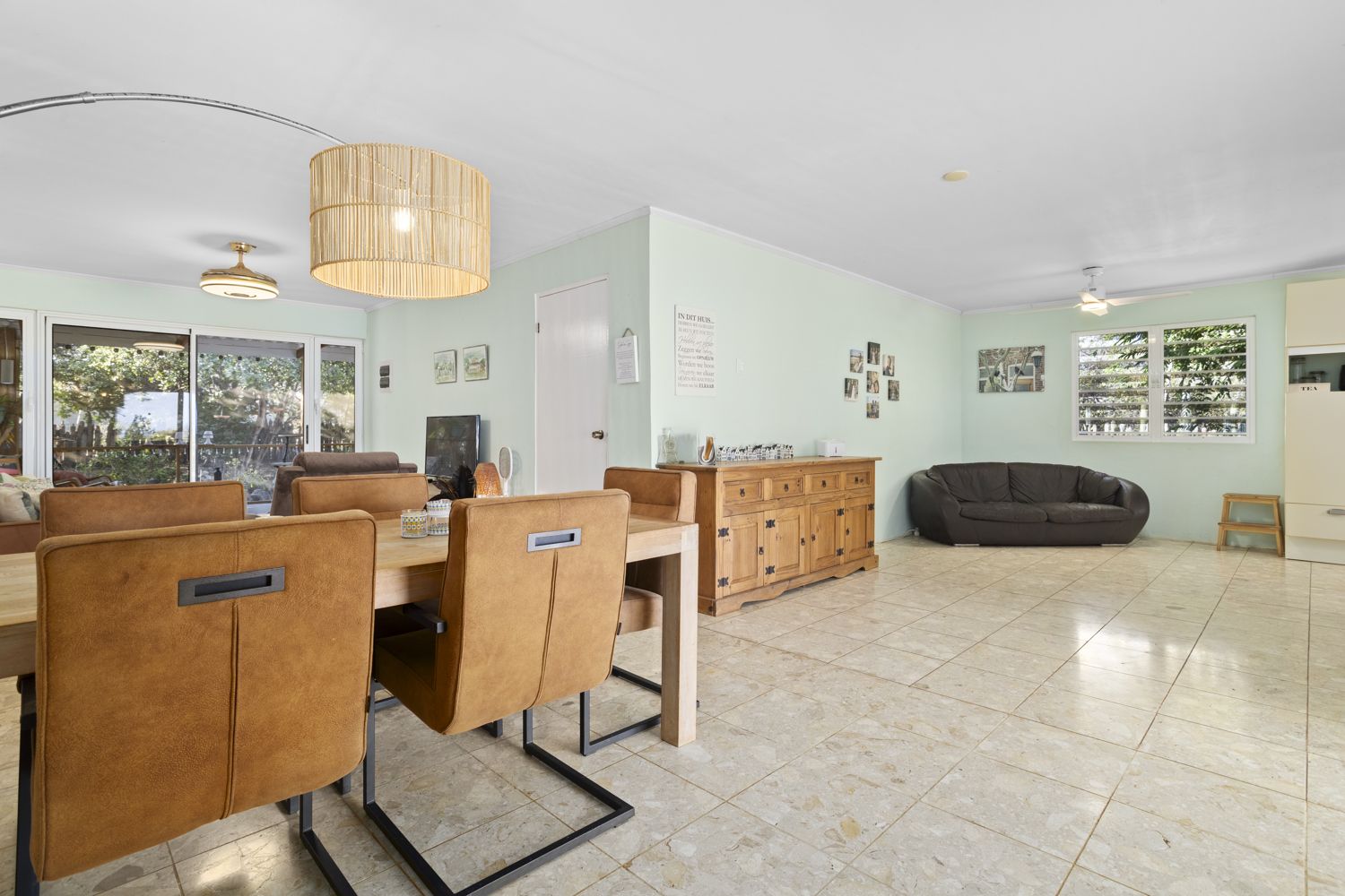 De lichte woon- en eetkamer vormen samen met de open keuken een aangename leefruimte met veel natuurlijk licht en natuurlijke ventilatie dankzij de shutters. De keuken is functioneel ingericht met voldoende kastruimte en werkblad.